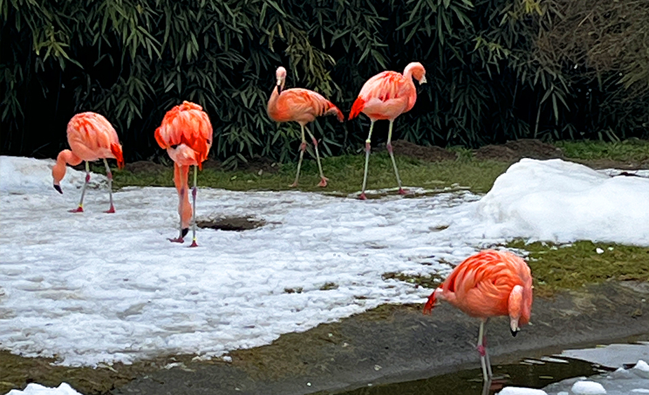 Dans la grande volière, découvrez flamants roses qui vivent au rythme des saisons autour d’un grand étang naturel.