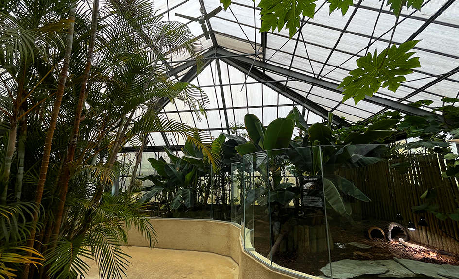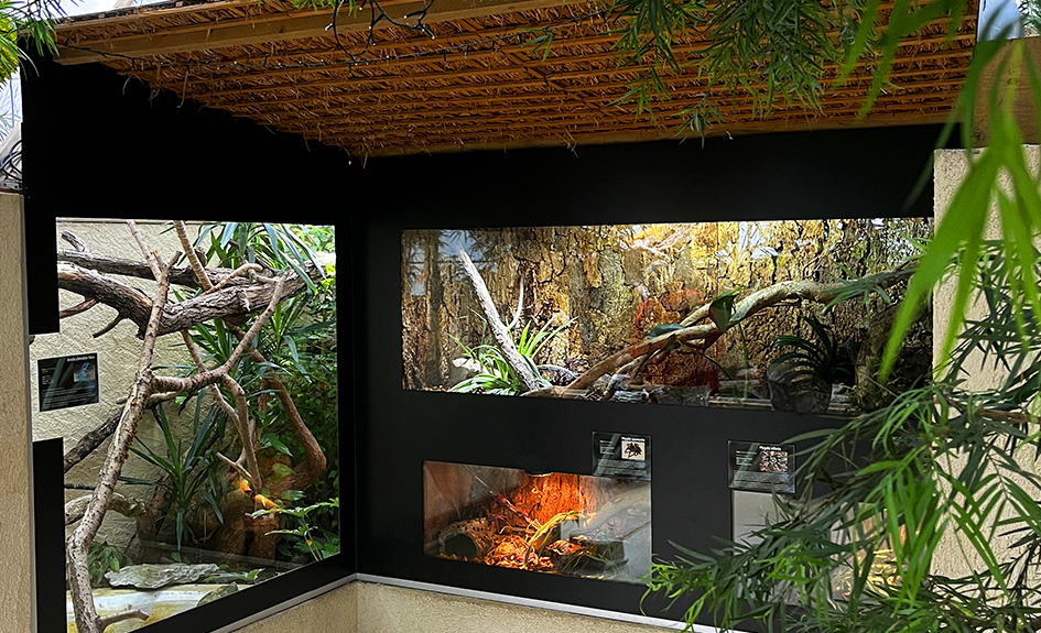Dans le vivarium, au travers d’une végétation luxuriante, de grands terrariums vous permettent de découvrir de petits reptiles et des amphibiens multicolores dans leur biotope naturel.