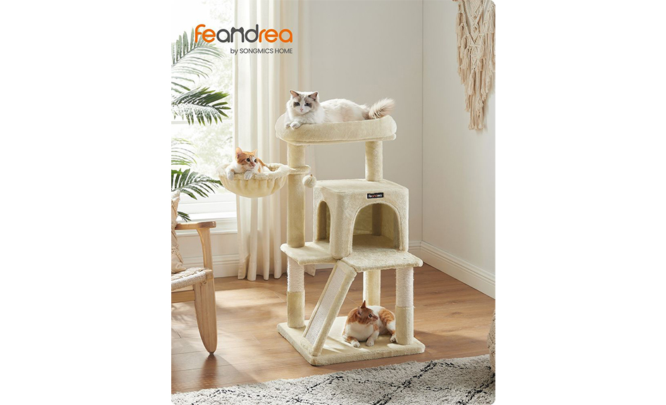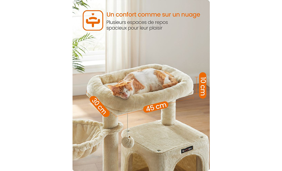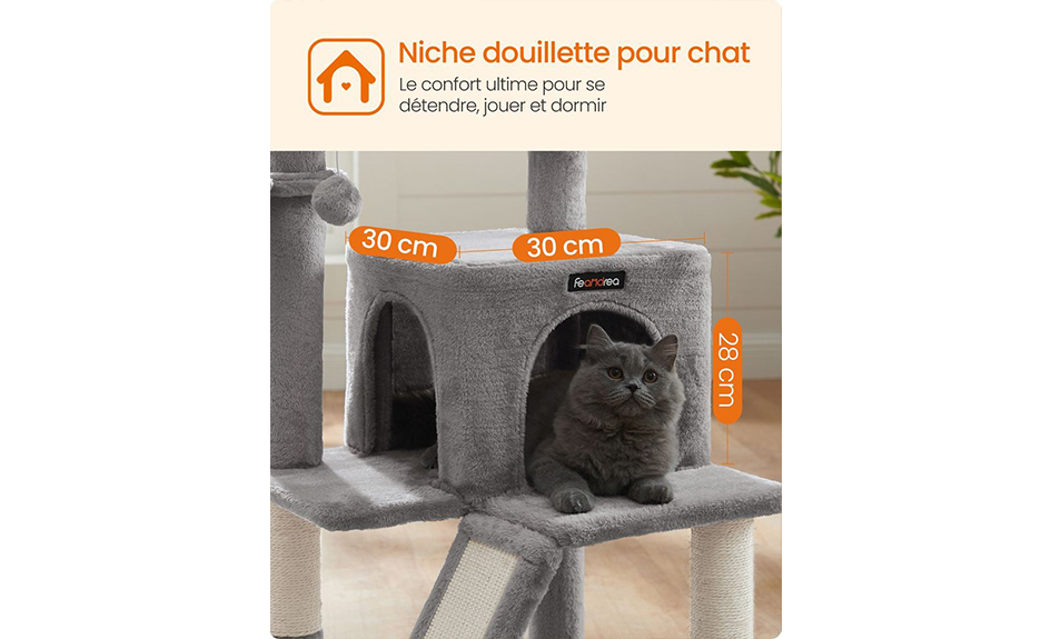 Grâce au bois composite de haute qualité et à la base renforcée, cet arbre à chat sera un excellent compagnon pour la croissance de votre chat