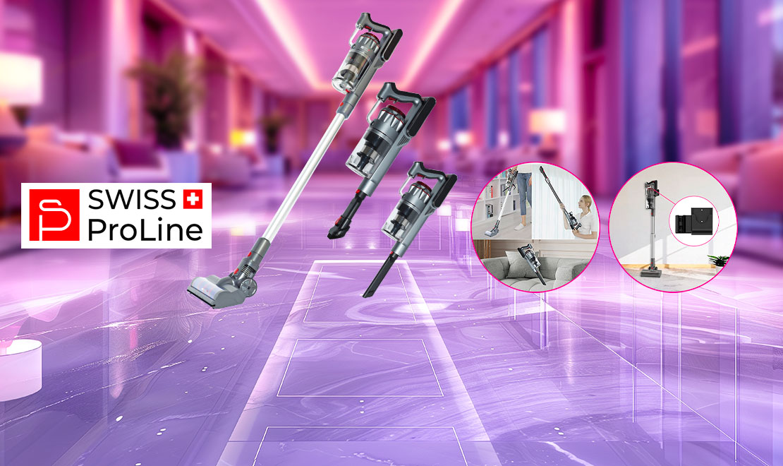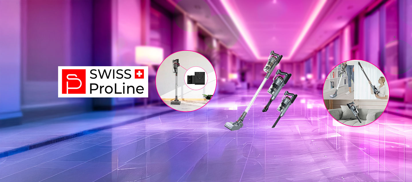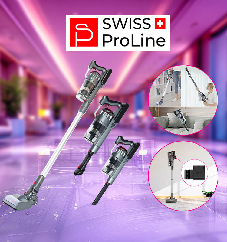 L’Aspirateur balai sans fil 2en1 (5 accessoires) Swiss ProLine combine puissance, autonomie et praticité.