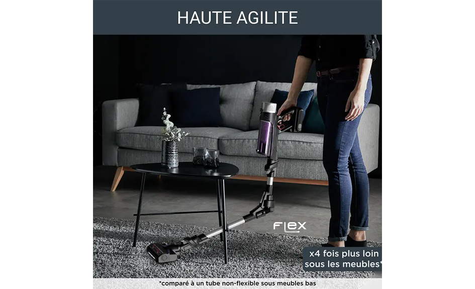 Son tube Flex permet d'aspirer sous les meubles bas pour un nettoyage complet sans vous pencher tandis que sa tête d’aspiration unique, dotée d'un éclairage avec LEDs, vous permettra de traquer la poussière.