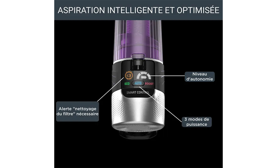Performances exceptionnelles renforcées par une technologie de pointe, avec un réglage automatique de la puissance d'aspiration en fonction du type de sol pour des résultats de nettoyage optimisés.
