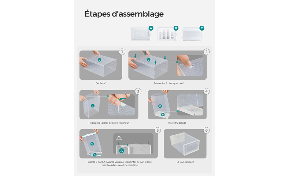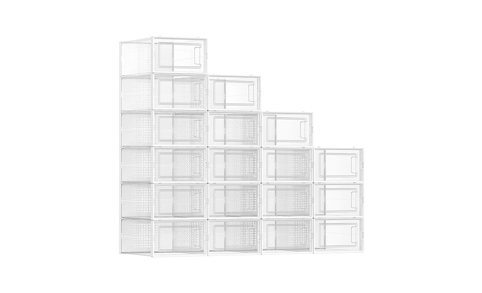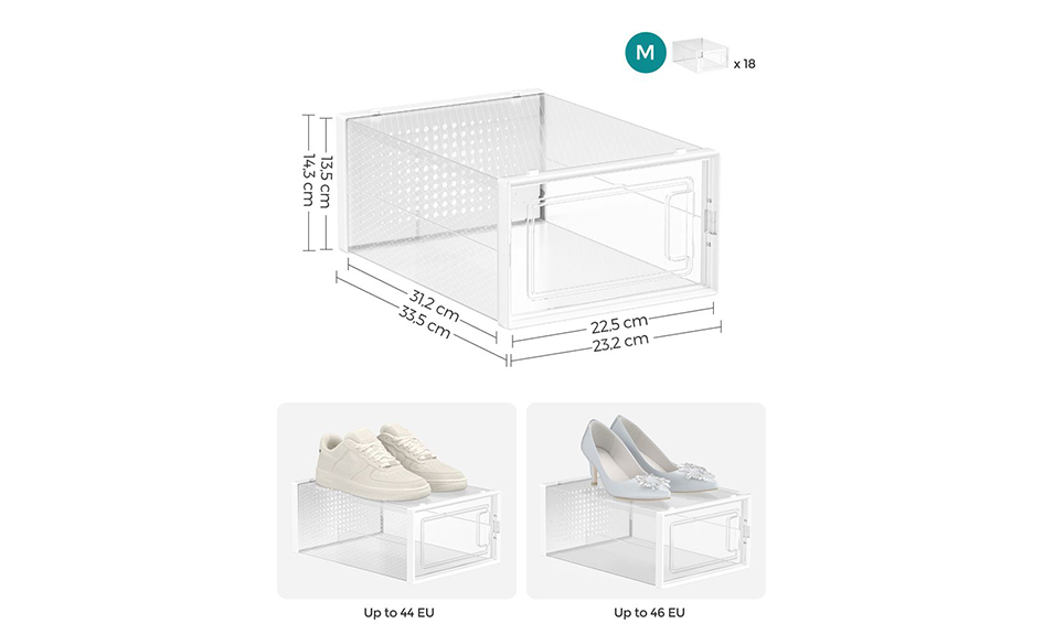 18 boîtes à chaussures transparentes avec porte frontale et trous d’aération pour éviter les mauvaises odeurs.