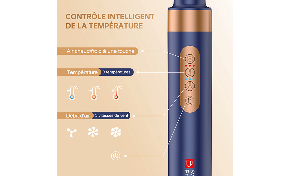 - Confort d’utilisation : 3 chaleurs, 3 vitesses + air froid