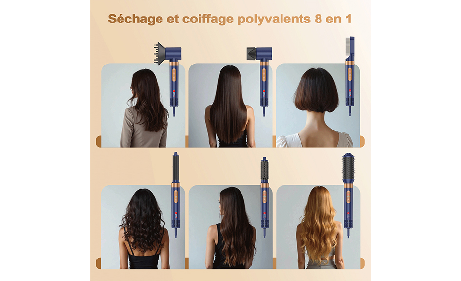- Polyvalente : 8 embouts interchangeables pour lisser, boucler, donner du volume ou sublimer vos boucles naturelles.
