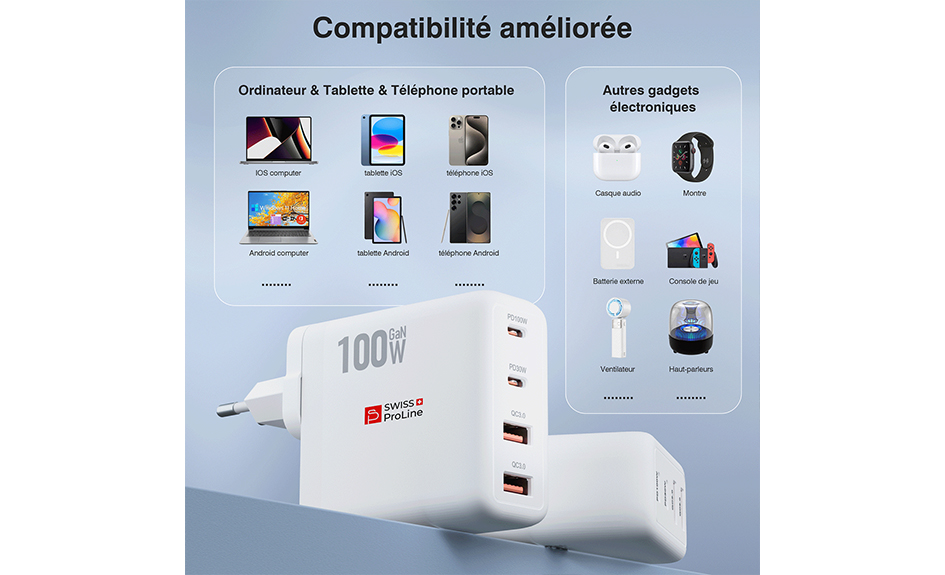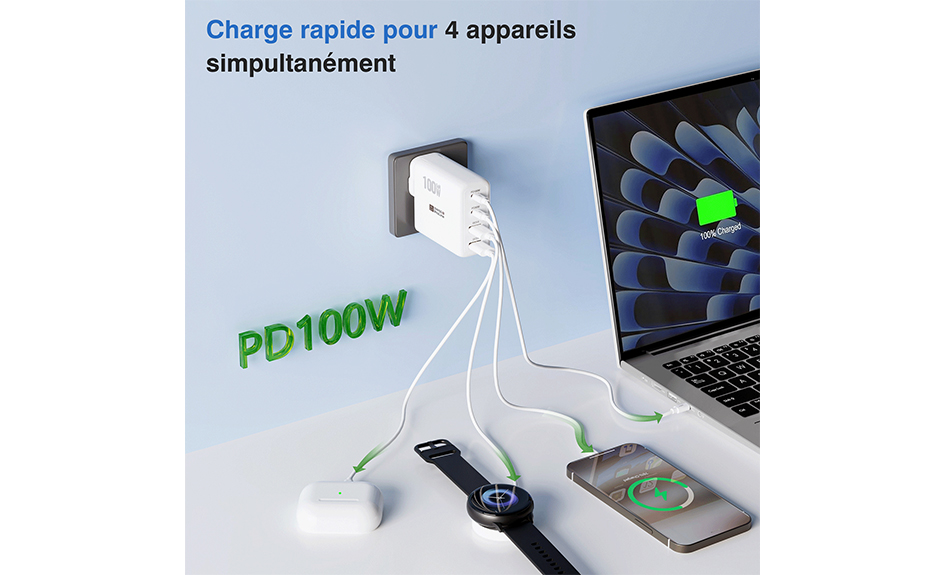 - Puissance totale 100W pour recharger ordinateurs portables, tablettes et smartphones en un temps record