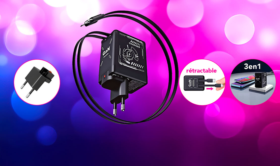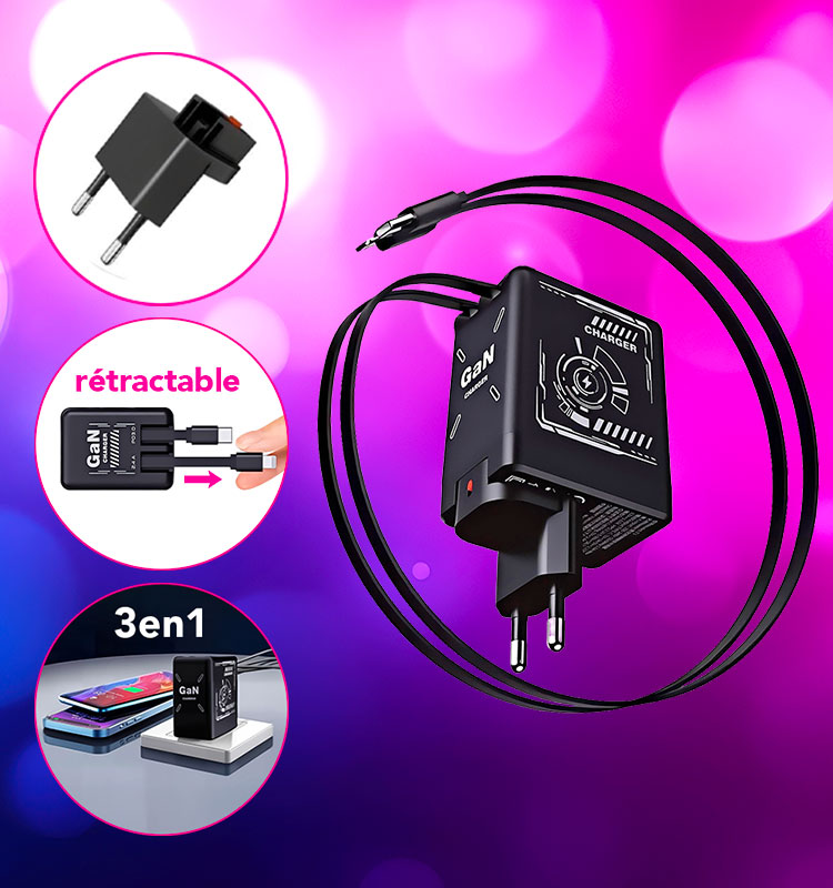 Chargeur pratique 3en1 avec 2 câbles rétractables intégrés