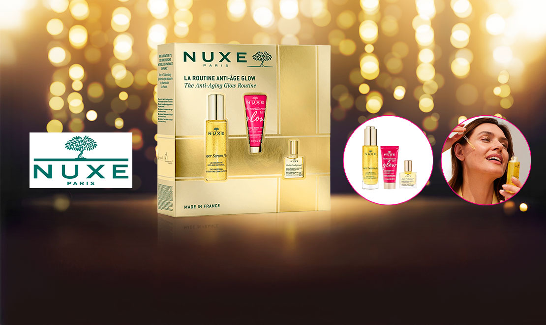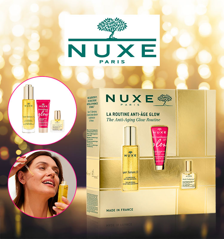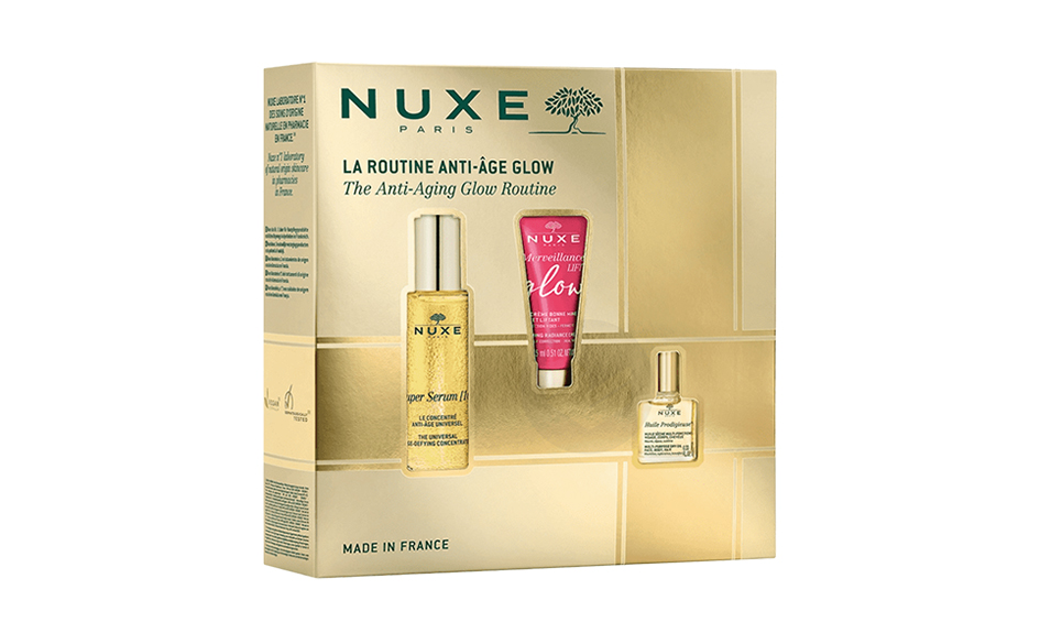Nuxe Coffret Noël 2024 La Routine Anti-Âge Glow regroupe vos alliés anti-âge pour une peau lissée et éclatante associés à l'iconique Huile Prodigieuse :