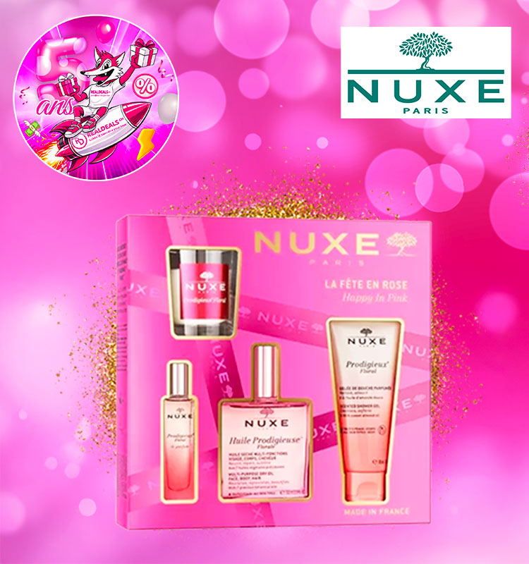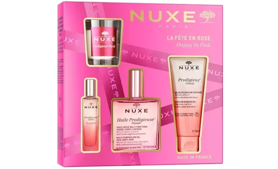 - Flash DEALS - Coffret Florale NUXE (Huile Prodigieuse 100ml, Parfum 15ml, Gel Douche 100ml, Bougie parfumée 70g) avec 70% de rabais