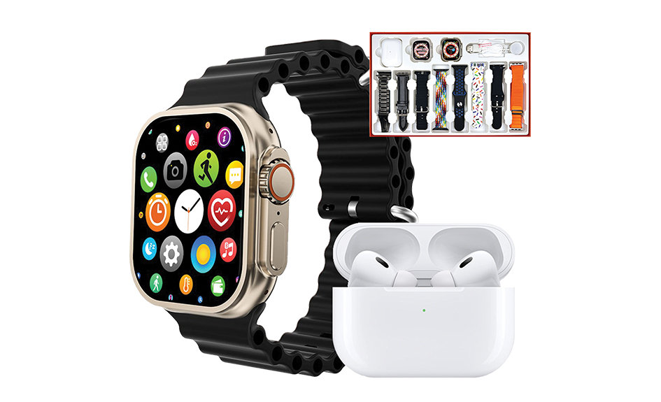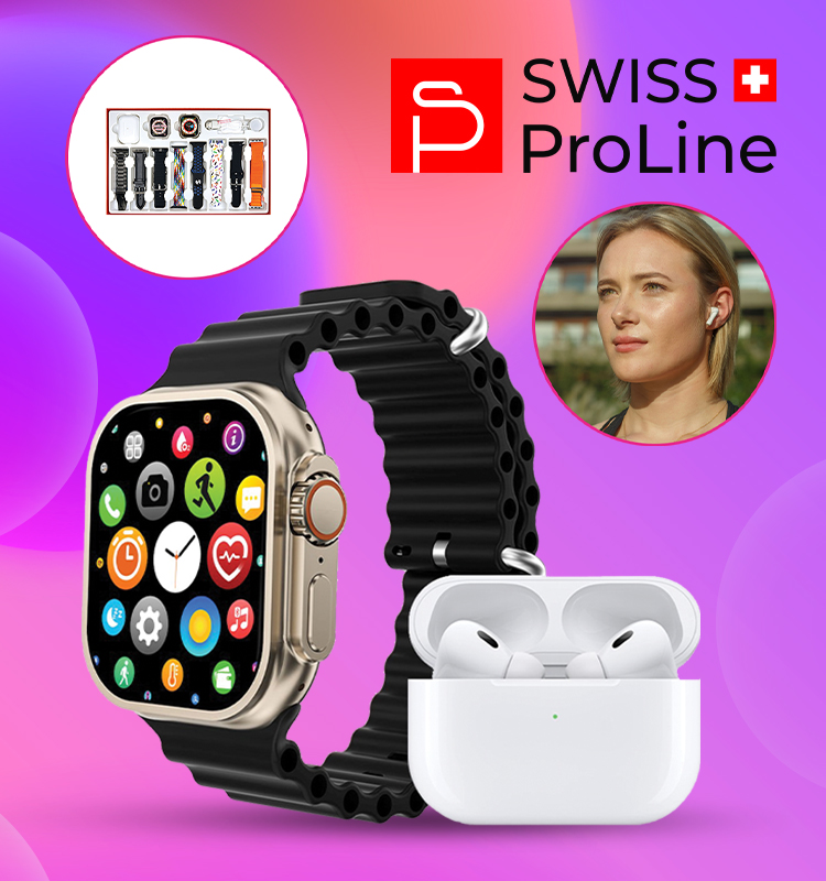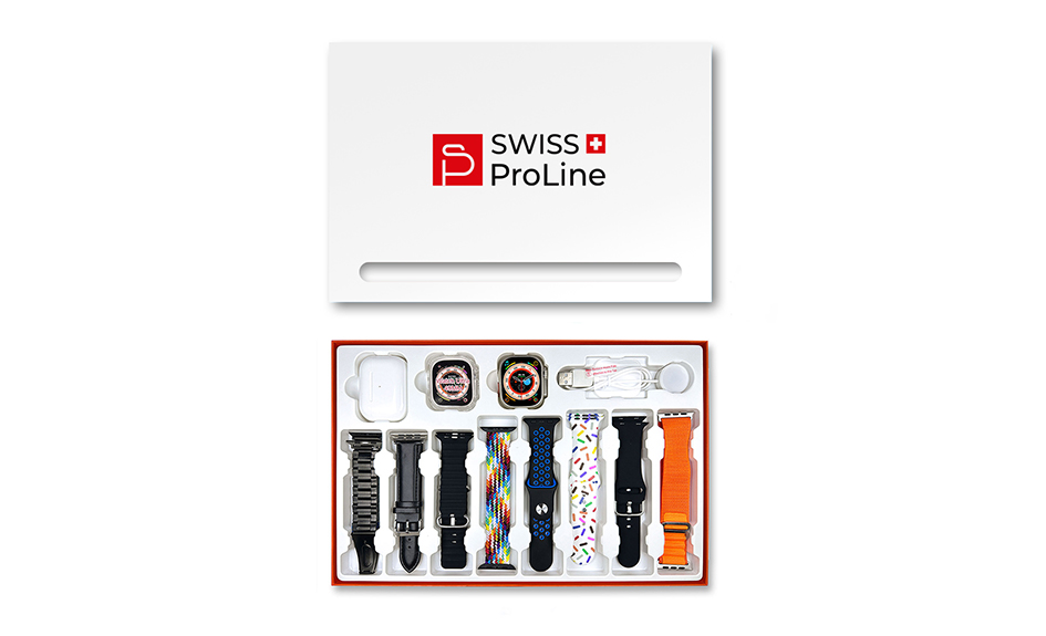 Coffret montre connectée, écouteurs sans fil Bluetooth, protection écran avec 8 bracelets Swiss ProLine
