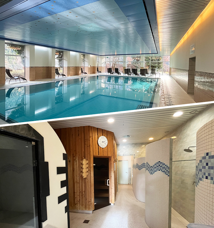 L'espace bien-être dans 800 m² de détente pure: piscine thermale d'eau saline (8x15 m 3% de sel)sauna, hammam, salle de fitness, solarium, inhalations, jacuzzi, massage, soin cosmétiques, aquagym, méditation, MTE (médecine traditionnelle européenne avec des applications médicales telles que la thérapie respiratoire, kinésiologie, Meridian massage,) mais aussi la physiothérapie classique.