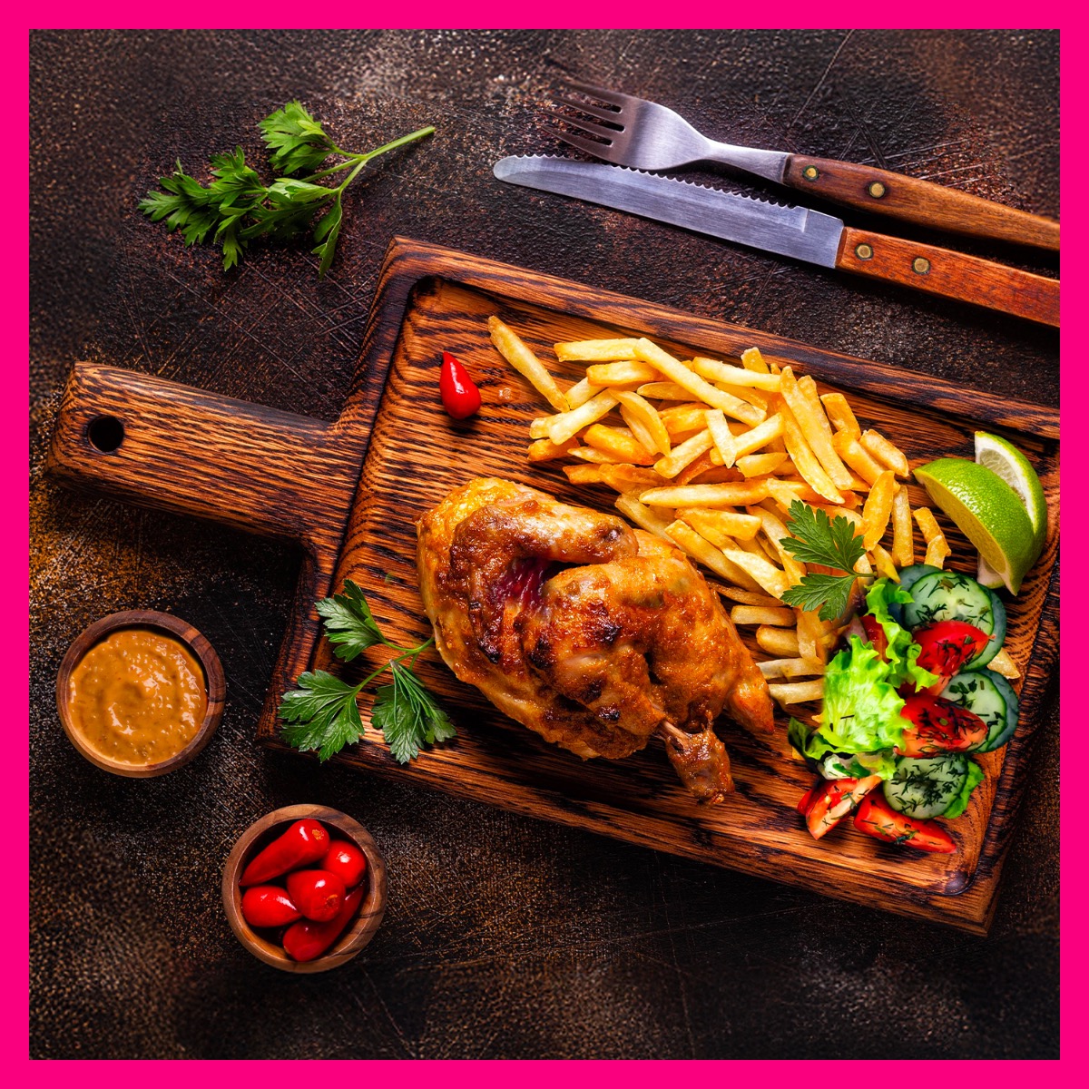 Plat: Poulet grillé Demi-poulet mariné au piment, citron vert et herbes fraîches, grillé façon capverdienne, servi avec frites maison et légumes croquants, accompagné de notre Sauce Alegria