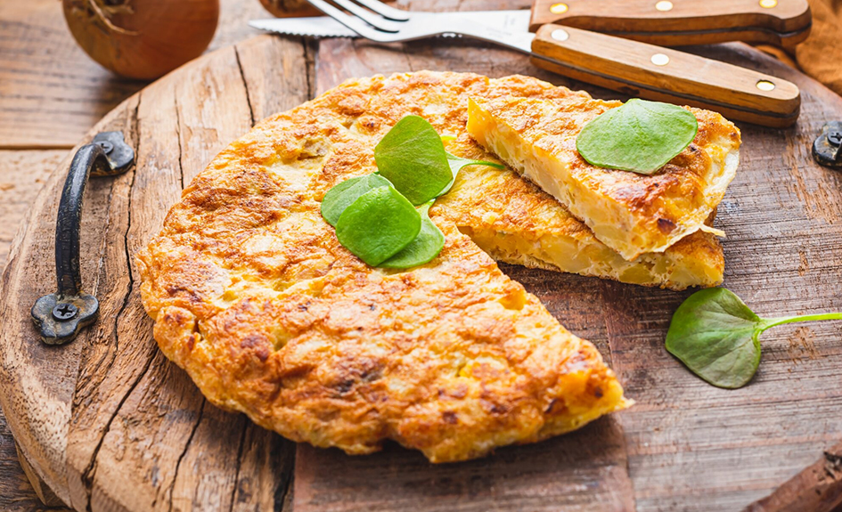 Entrée: Tortilla Española L’authentique omelette espagnole aux pommes de terre et aux oignons, servie tiède