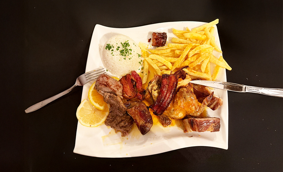 Plat: Grillade mixte Alegria Trio de viande: Poulet grillé, travers de porc et saucisse de porc, servi avec frites maison et légumes croquants