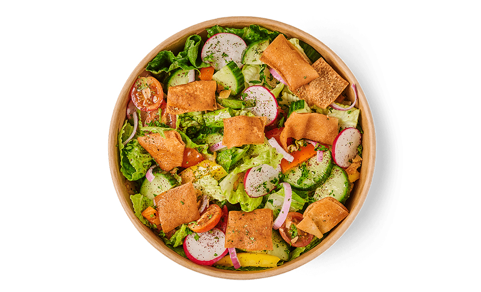 Fatouch : Salade composée de légumes frais et de morceaux de pain pita grillé, assaisonnée avec du citron, de l’huile d’olive et du sumac