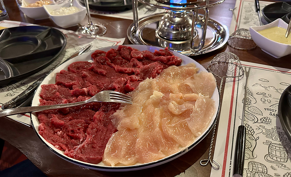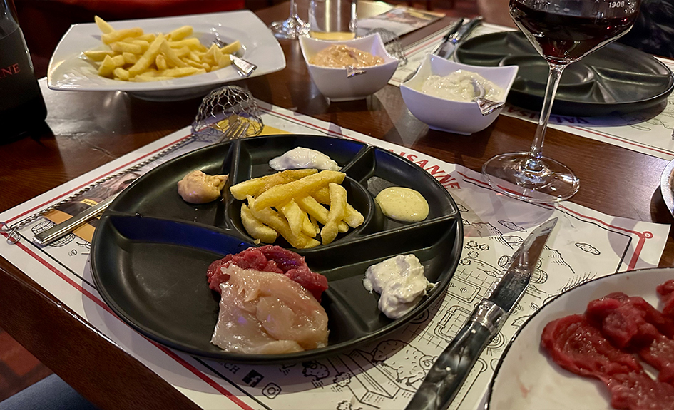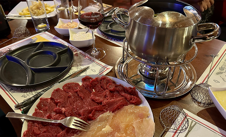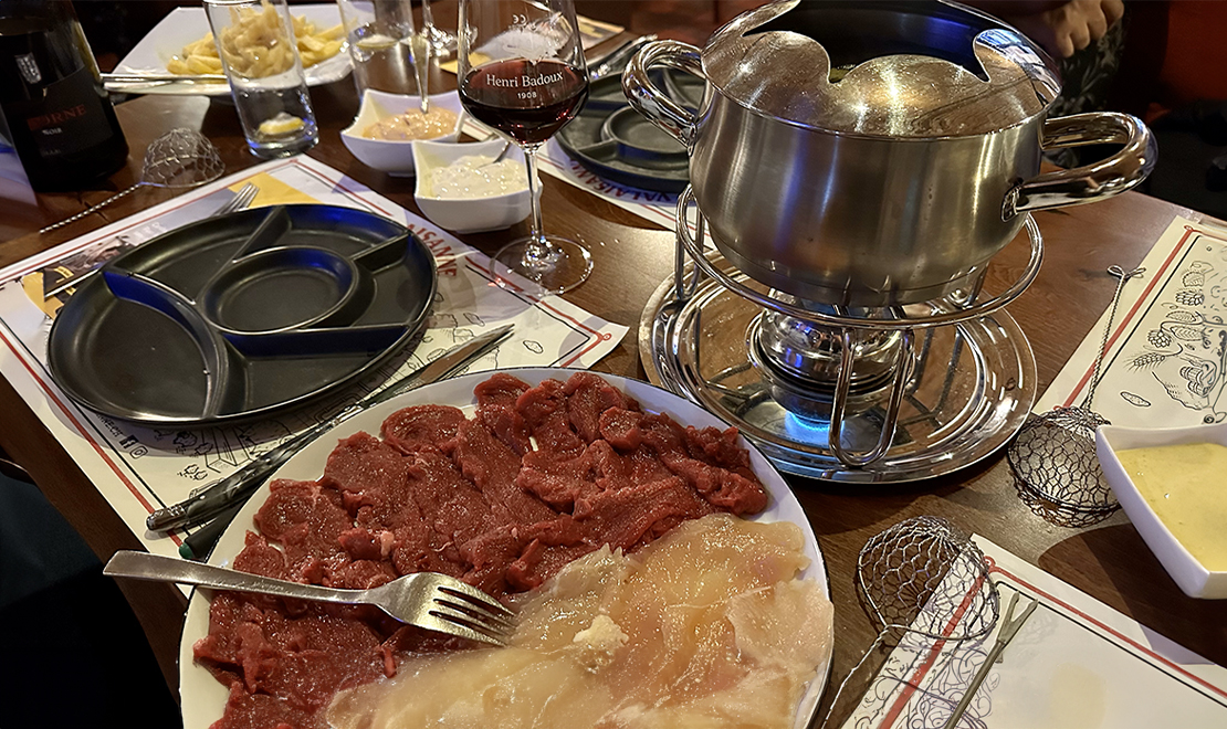 Plat: Fondue chinoise (250 grammes de viande par personne) avec frites et sauces