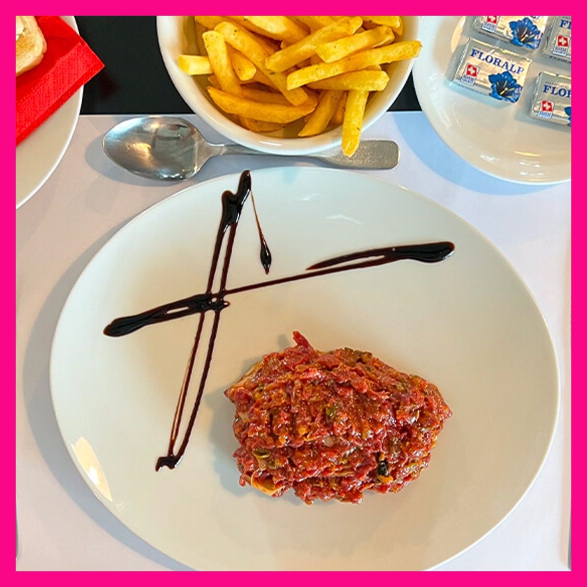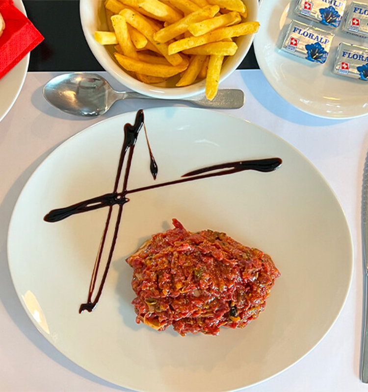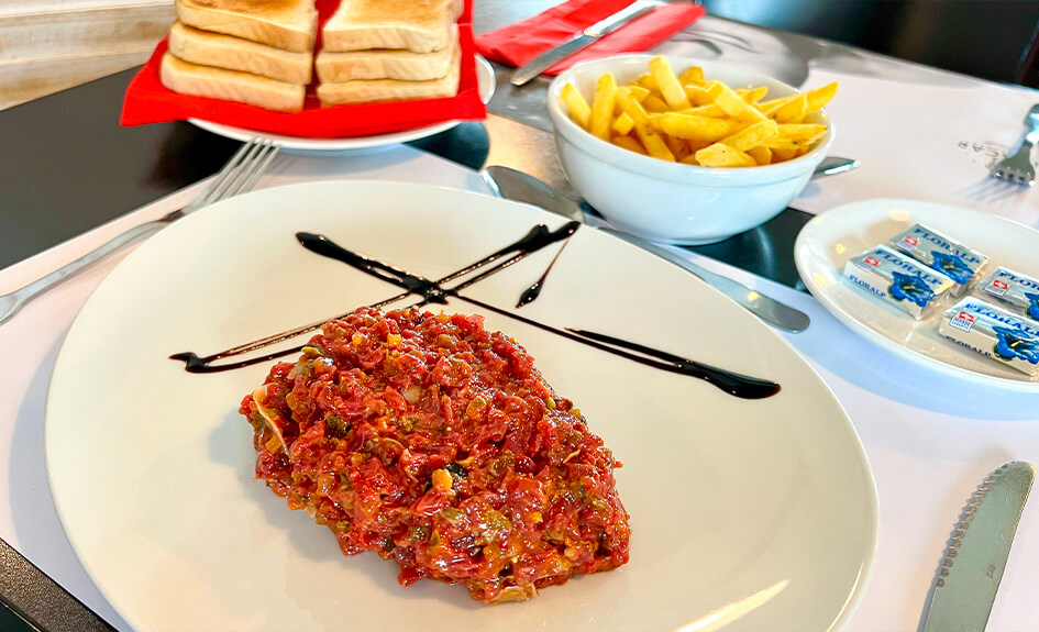 Plat: Tartare de boeuf coupé au couteau (180 grammes par personne), toasts grillés, beurre et pommes frites maison