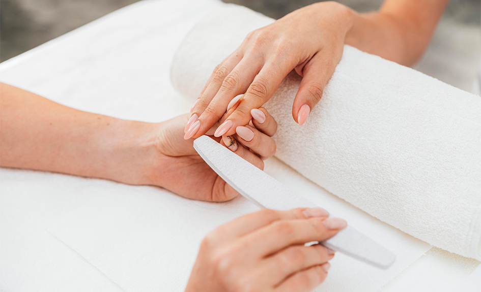 La pose de vernis semi-permanent commence par préparer les ongles en les nettoyant, les limant et en repoussant les cuticules.