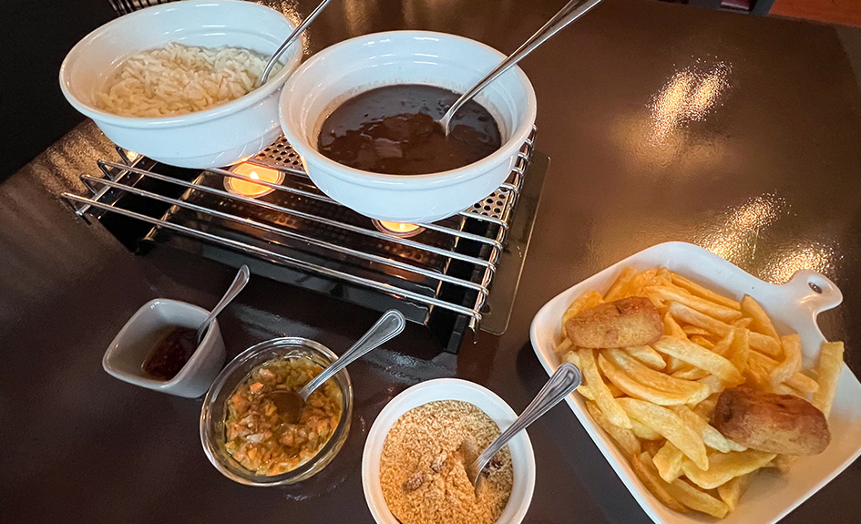 Le Rodizio, un défilé de viandes grillées sur de grandes brochettes et découpées dans l’assiette, servies à volonté et accompagnées de riz, frites, haricots noirs et bananes frites.