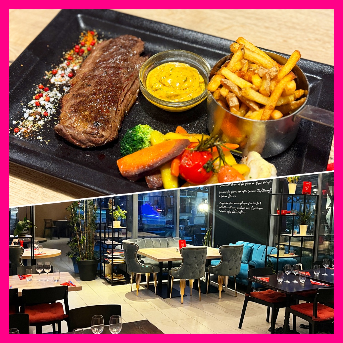Plat : Bavette de Boeuf sauces maison (Café de Paris ou 3 poivres ou chimichurri), accompagnée de pommes frites maison et petits légumes