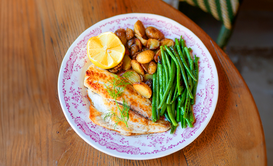 Plat: Filets de perche meunière au beurre citronné accompagnés de légumes et de pommes grenaille