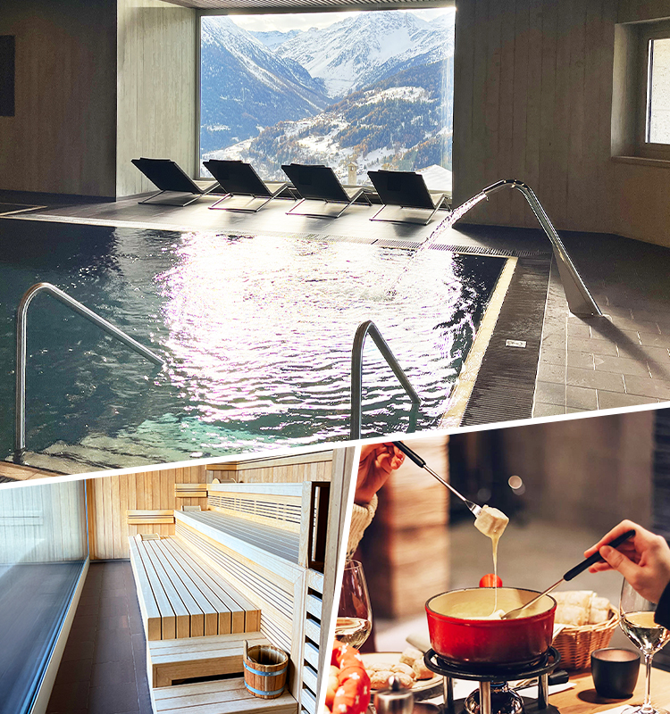 Profitez de la piscine chauffée avec vue sur les montagnes, des jets massants, du hammam, du sauna panoramique et d’un espace de repos face à la vallée.