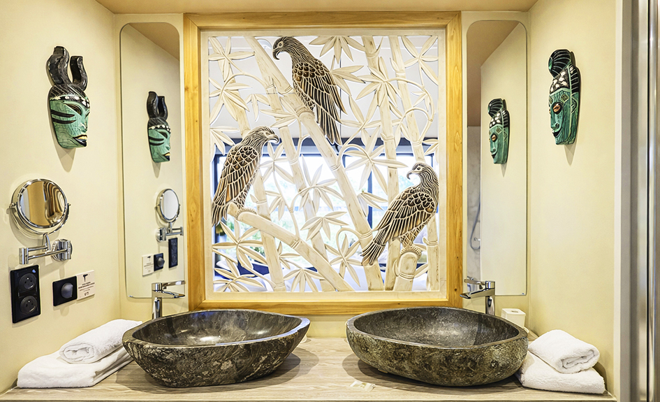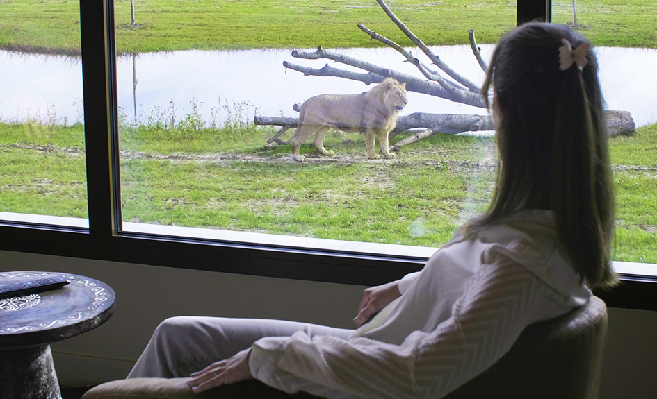 Chaque chambre, offre une vue imprenable sur un territoire de plus de 40 000 m², où une famille de lions d’Afrique évolue librement entre vallons, points d’eau et enrochements.