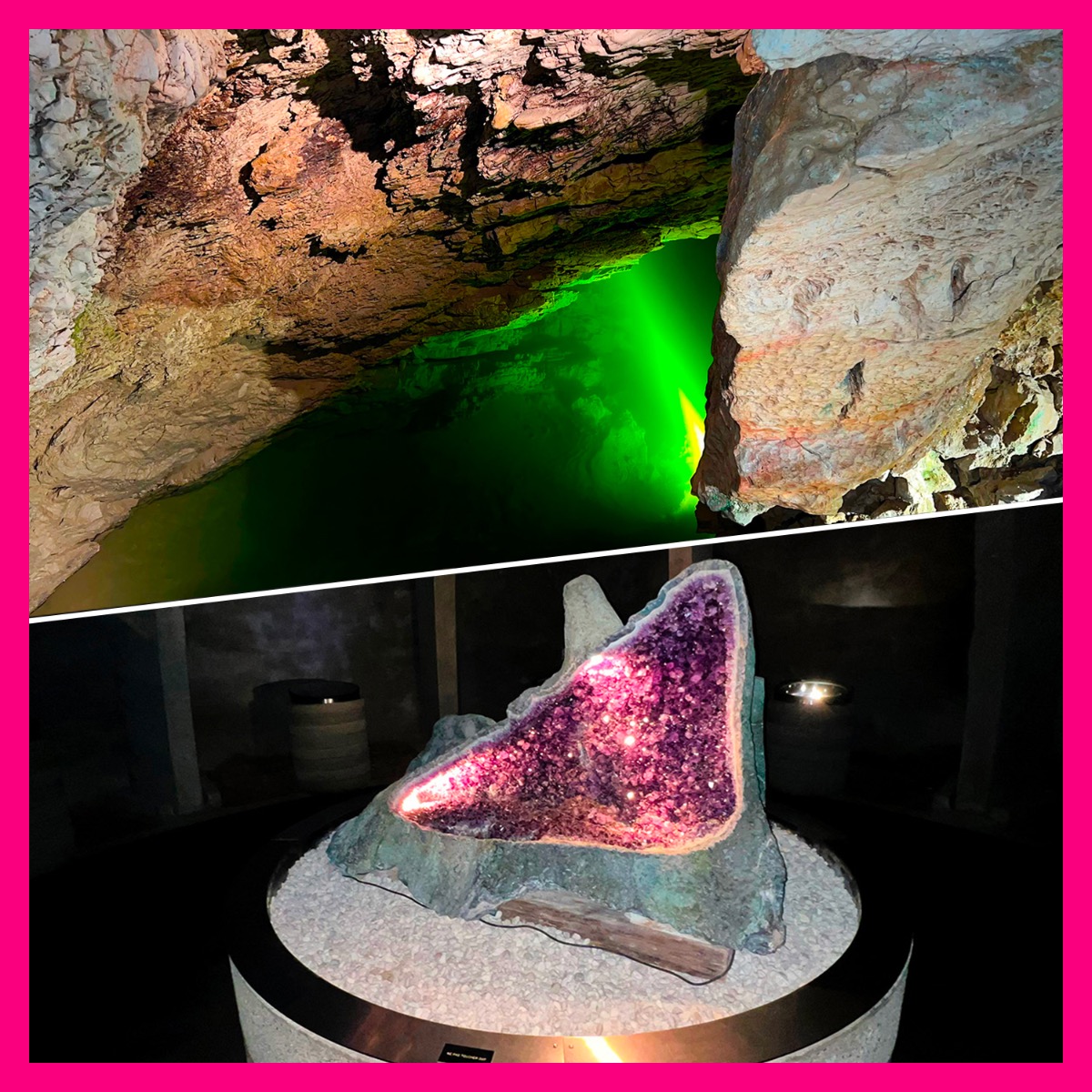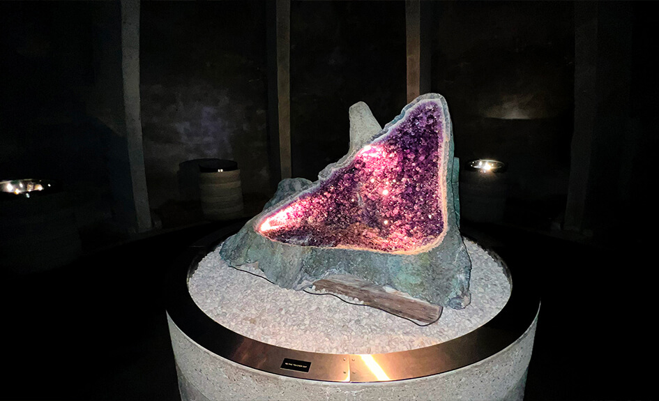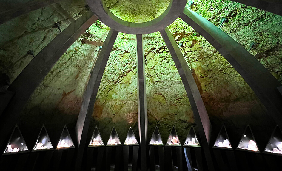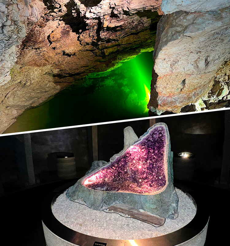 A l’intérieur même de ces cavités, qui figurent parmi les plus belles d’Europe, siège une exposition de minéraux, ‘Le Trésor des Fées’, regroupant une collection de plus de 250 minéraux du monde entier sous quatre coupoles creusées à même la roche.