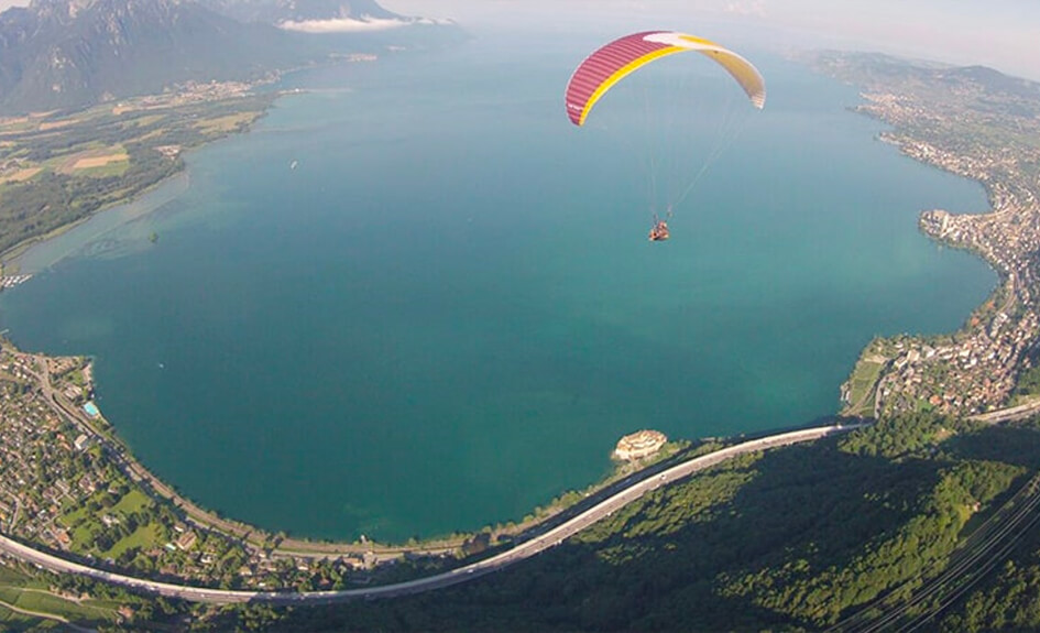 Décollage aisé et vue imprenable sur le lac Léman, le Château de Chillon sous vos pieds avec Montreux et la Riviera en toile de fond !