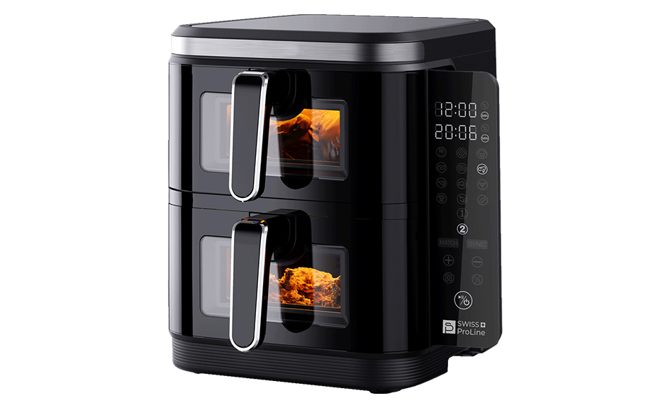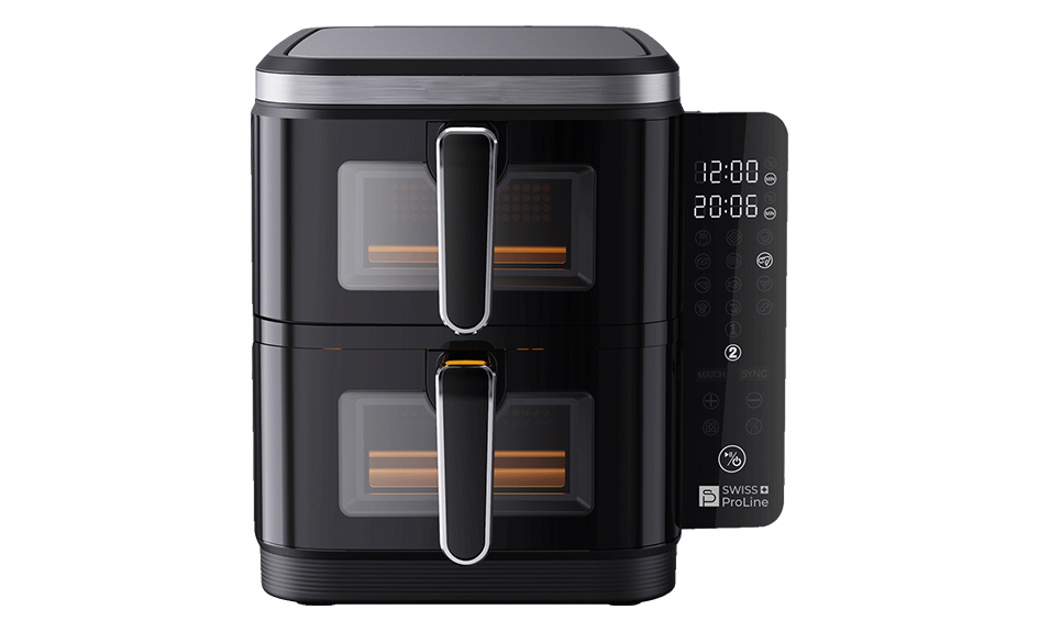 Découvrez la Swiss ProLine, la friteuse à air double panier de nouvelle génération, conçue pour allier performance, gain de place et facilité d’utilisation.