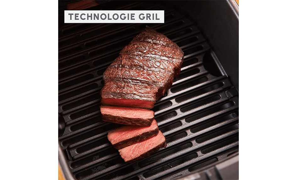 Son gril intégré avec revêtement antiadhésif et système d’égouttage vous permet de saisir parfaitement viandes, poissons ou légumes, tout en gardant les saveurs intactes.
