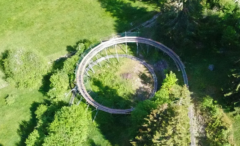 Accrochées à deux rails façon montagne russe, les luges deux places offrent une descente rapide mais toujours maîtrisable, grâce à des manettes de frein intégrées.