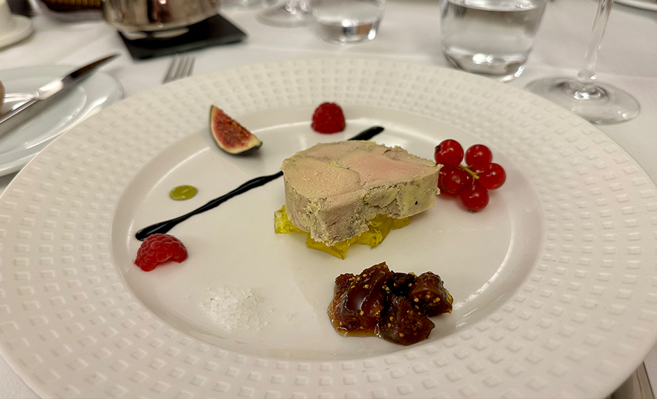 Entrée: Terrine de foie gras sur gelée de vin doux et son chutney figues-raisins