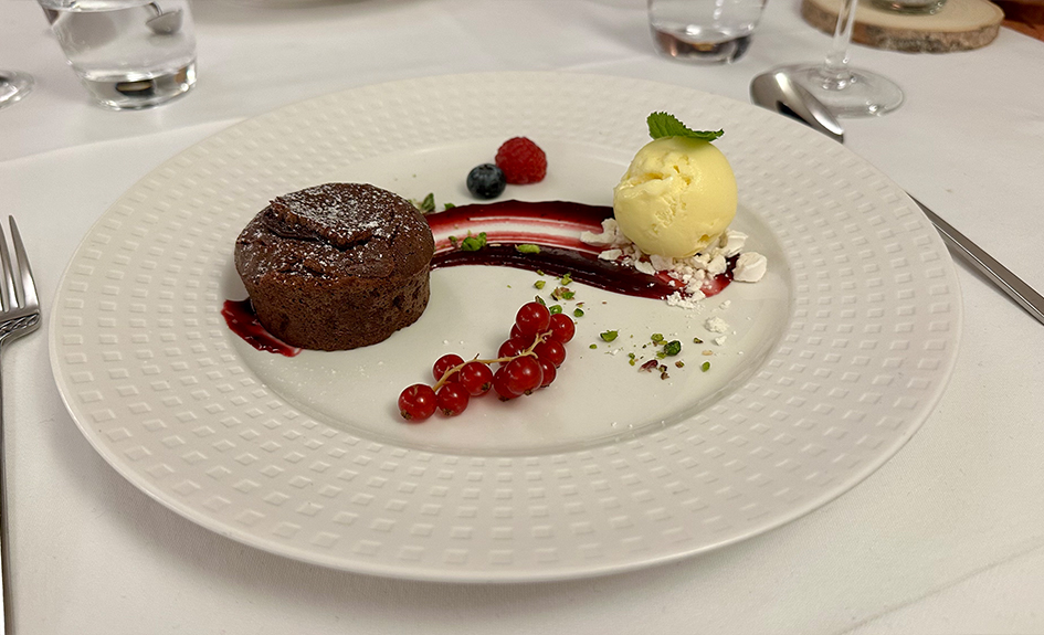 Dessert: Moelleux au chocolat Maison sur coulis de fruit rouge accompagné de sa glace vanille