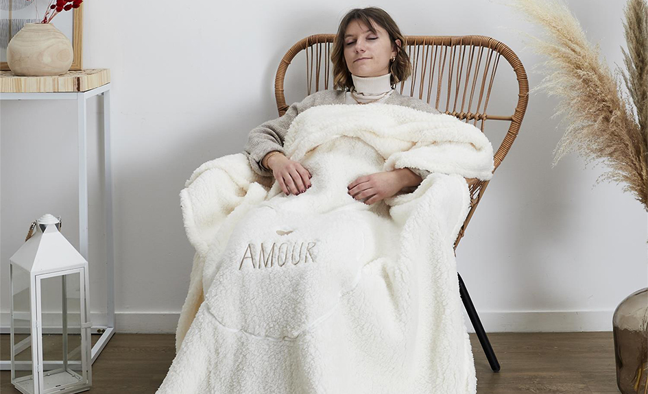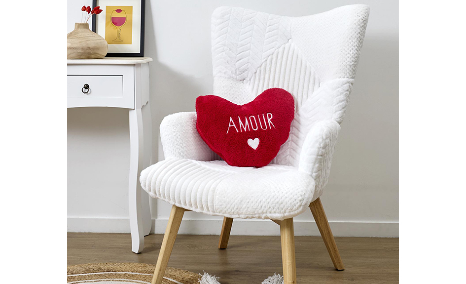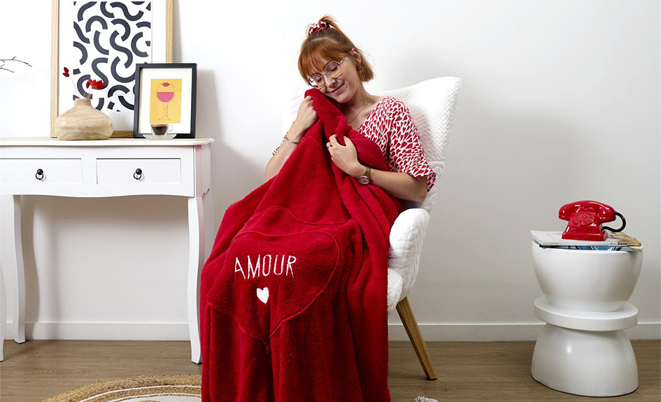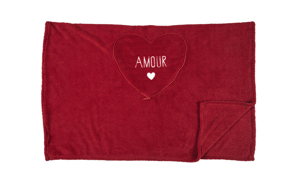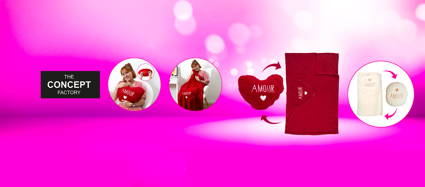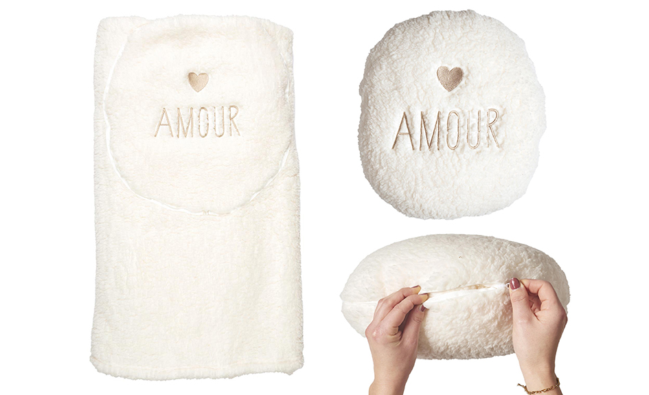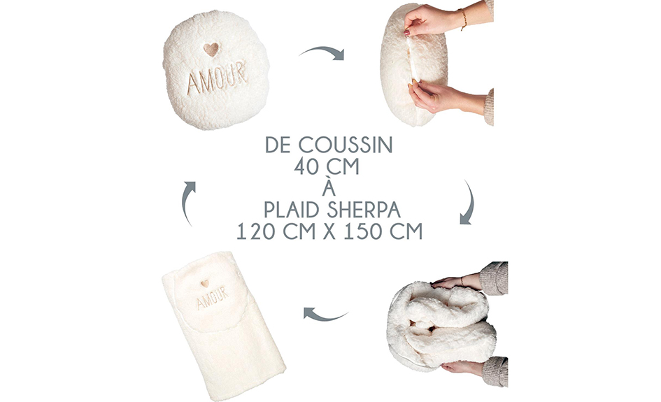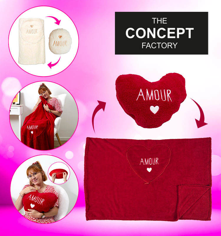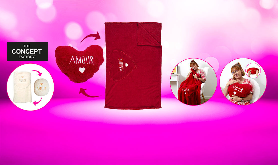 - Adorable coussin coeur qui cache un plaid doux et réconfortant