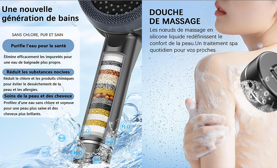 Filtre l’eau grâce à des pierres minérales pour réduire le chlore, les métaux lourds et les impuretés, tout en respectant la peau.