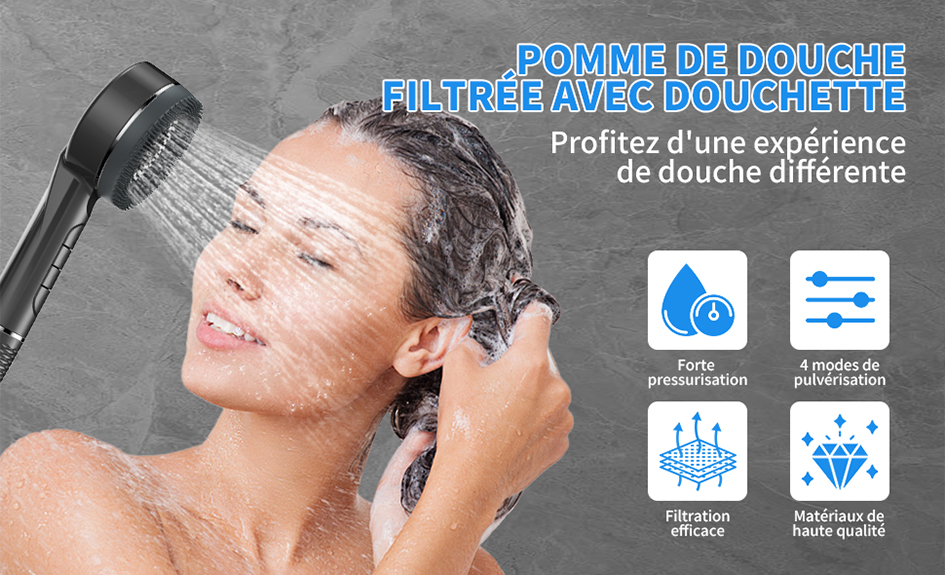 Pommeau de douche avec 4 modes puissants (tuyau de douche et support inclus)