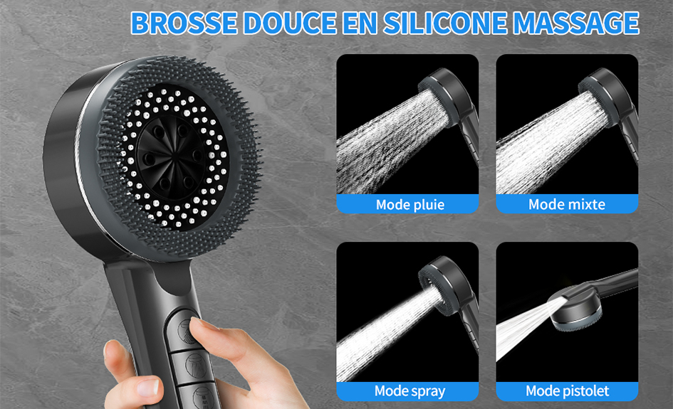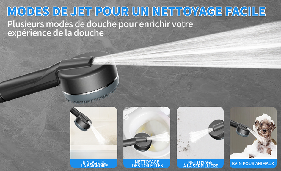 Un bouton permet de choisir facilement entre 4 jets : massage, pluie, brume et jet puissant (idéal pour le nettoyage de la salle de bains) pour un confort personnalisé.