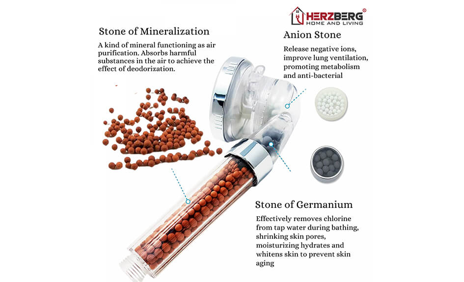 Le système de filtration des pierres bioactives purifie l’eau de la douche, élimine 99% des toxines du chlore de l’eau et améliore l’apparence saine des cheveux et de la peau, il rajeunit et aide à absorber les minéraux sains de la peau.