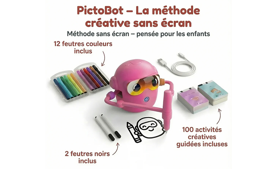 Le PictoBot est un robot éducatif interactif conçu pour accompagner les enfants dès 3 ans dans leur apprentissage artistique.