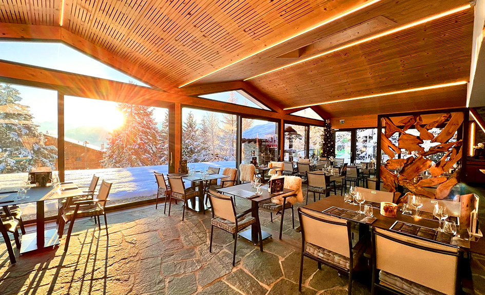Durant toute l’année, notre magnifique véranda offre une vue exceptionnelle sur les splendides montagnes du Valais.