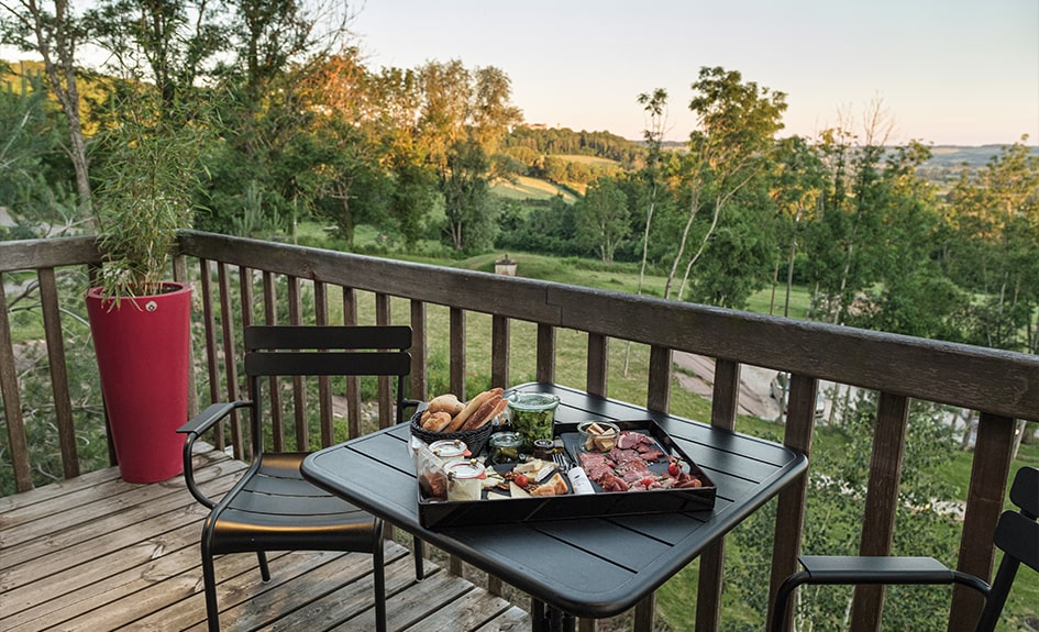 Une vue panoramique sur les paysages de la région depuis votre terrasse ou balcon privés végétalisés et surtout, un jacuzzi® privatif dans sept des huit hébergements.