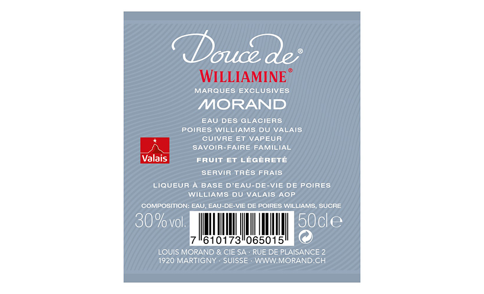 Liqueur de poires Williams du Valais AOC de haute qualité, au nez typique du fruit et au goût riche, complexe, long en bouche et bien équilibré.