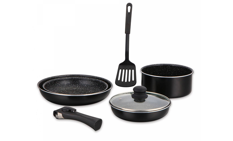 - Set de 3 poêles et 1 casserole en marbre avec poignée amovible Herzberg avec 67% de rabais