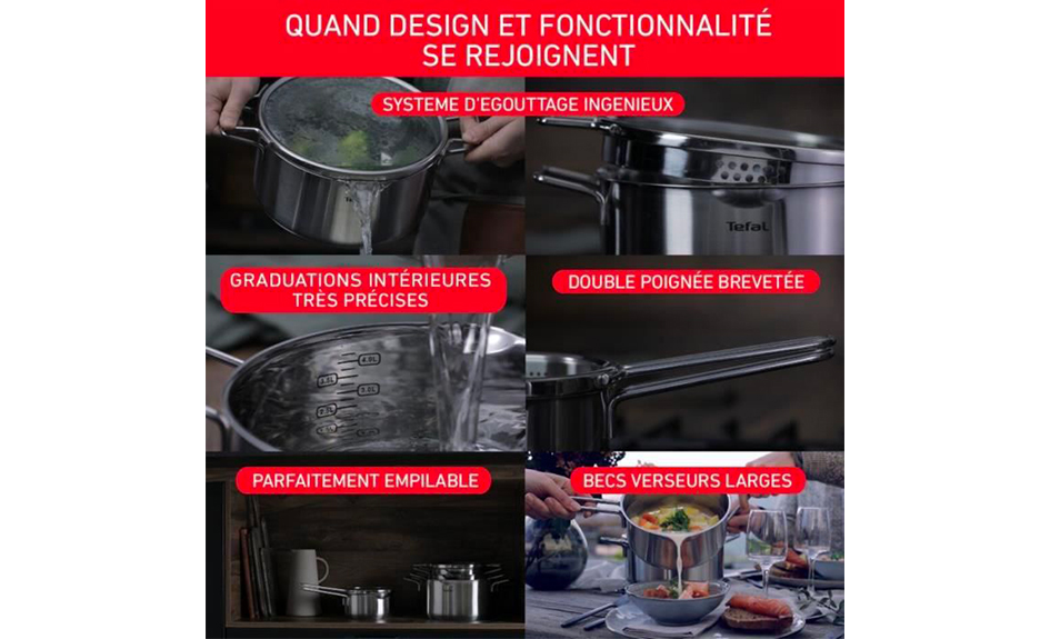 Ces faitouts en inox de qualité supérieure offrant une diffusion optimale de la chaleur sont idéaux pour préparer de délicieux repas pour toute la famille, avec une esthétique épurée qui n'a d'égal que son design ingénieux : doubles poignées brevetées, becs verseurs intégrés et couvercle filtrant astucieux pour égoutter vos préparations en toute sécurité et sans effort.
