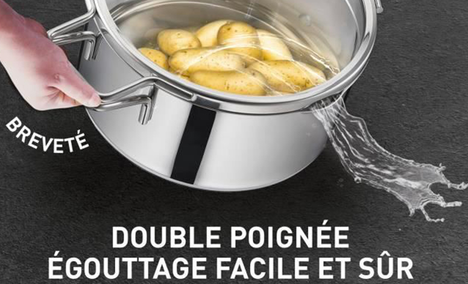 Poignées doubles brevetées avec des becs verseurs intégrés et un couvercle d'égouttage astucieux, pour un égouttage sûr et facile.