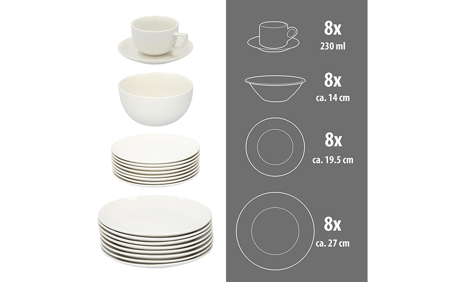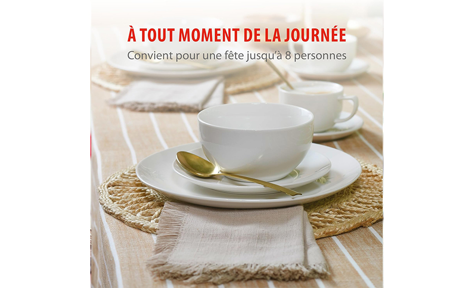 Le service de table pour 8 personnes présente une couleur blanche, une forme ronde et une apparence neutre.