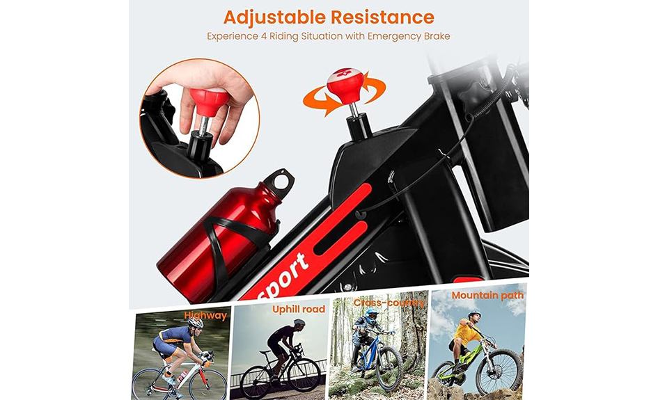 Ce vélo est conçu en acier et plastique robustes, arborant un design noir et rouge.