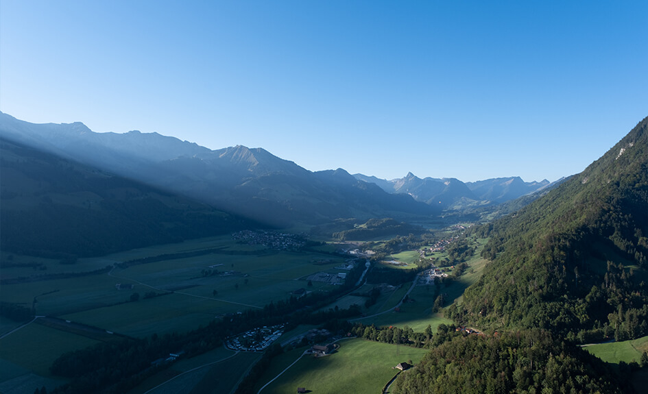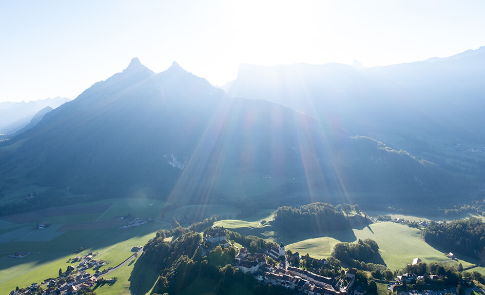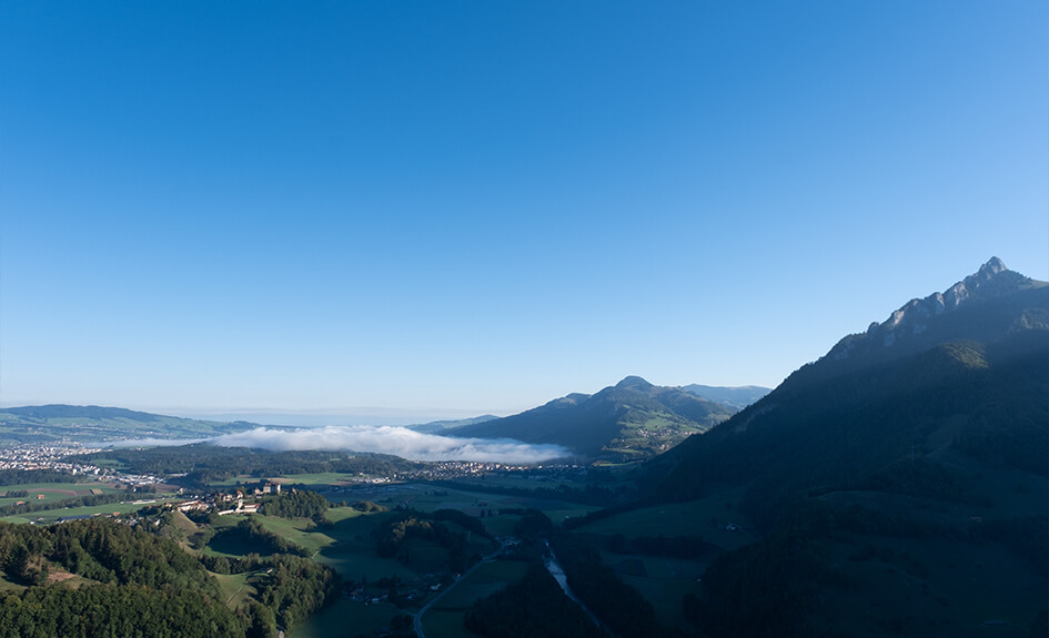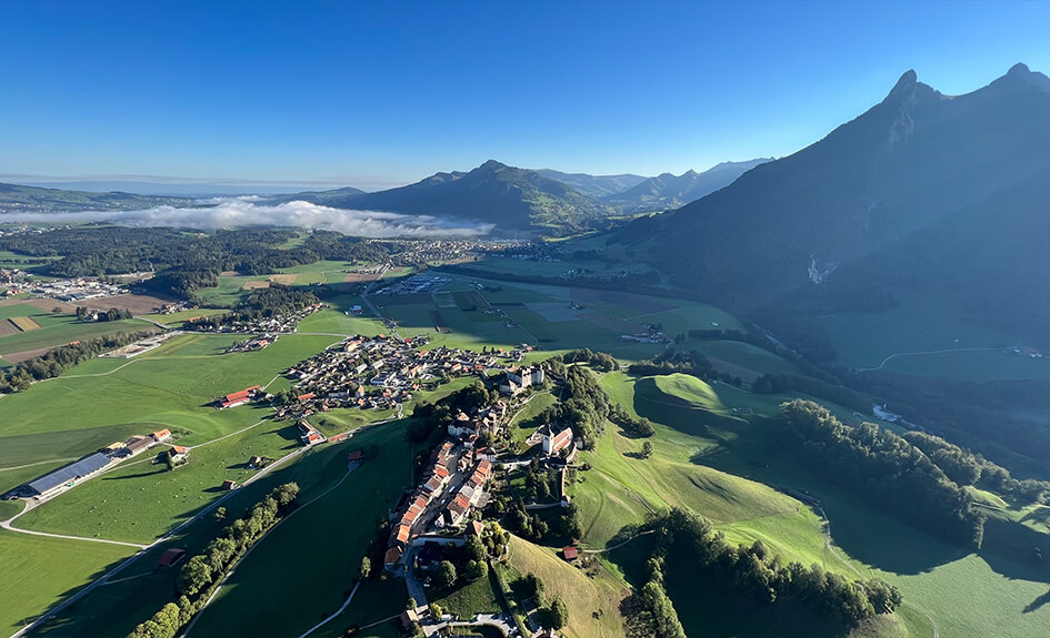 De mai à fin octobre, il vole également en soirée, sur le Plateau Fribourgeois avec vue sur le Château de Romont, la belle ville de Fribourg ou la région du Lac de Gruyère, avec les magnifiques montagnes des Alpes en arrière-fond.